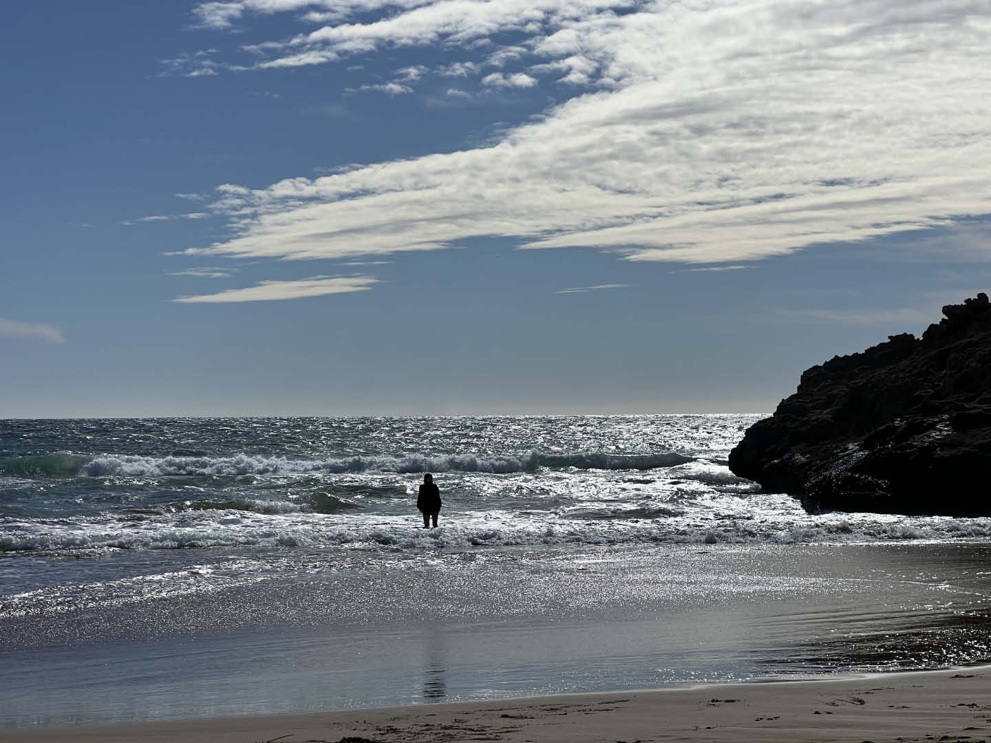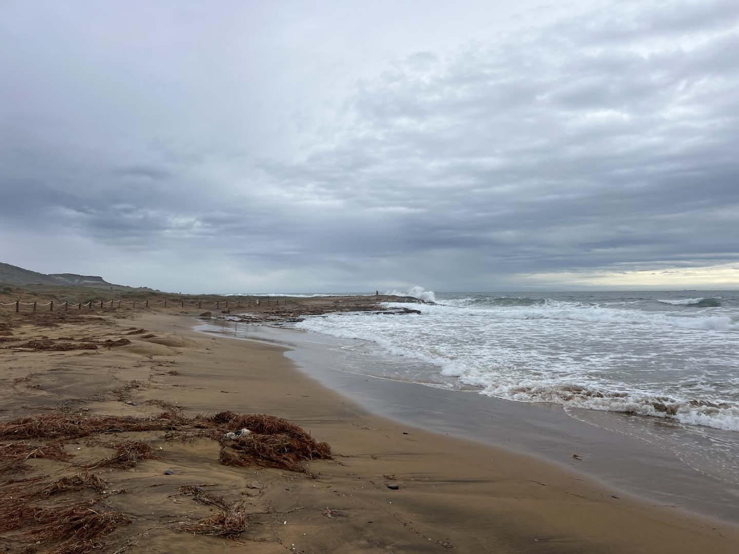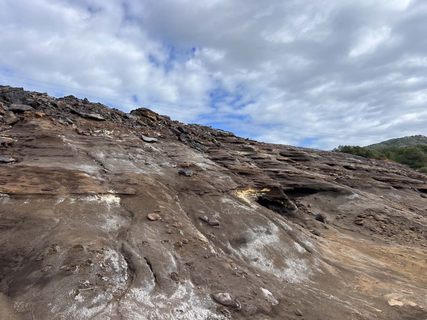 We vinden het strand zo raar en dat stuk rechts van de dijk. Pas later vind ik uit wat dat is. Hier was in de Romeinse tijd al een van de belangrijkste zilver en loodmijnen van Romeinse rijk